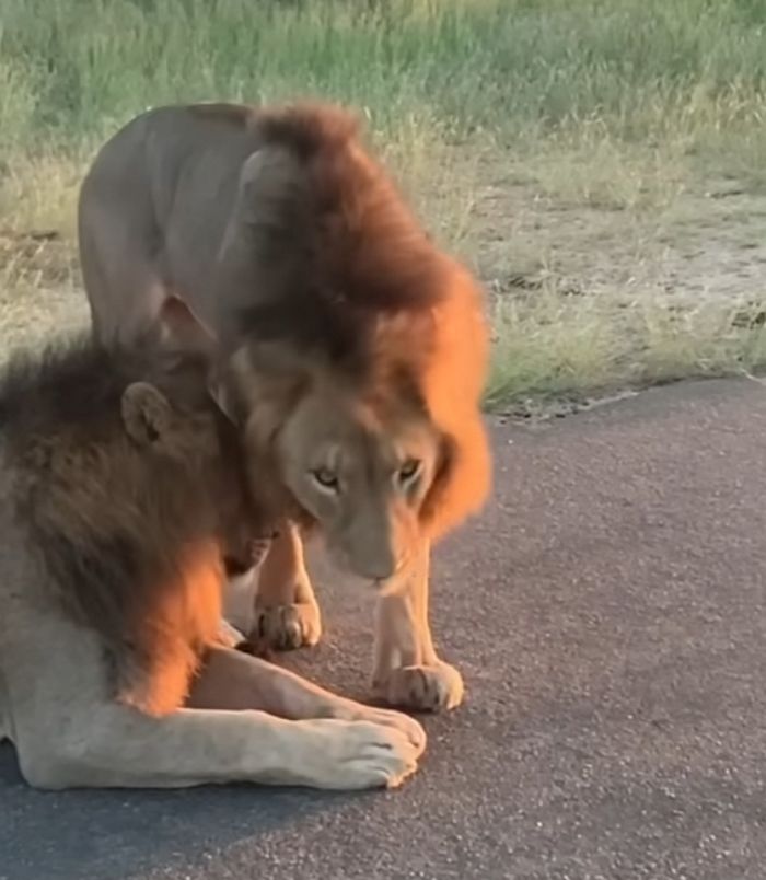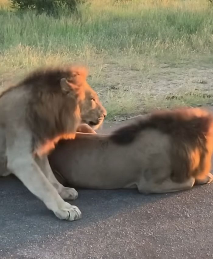 【引用:Youtube@Latestsightings】野生動物の専門家によオスライオン同士のこうした行動は既知の現象だ。社会的な結び付きの一形態と位置付けた。動物学者は複数の要因が関係すると説明した。オスライオンは群れを組み、連携して縄張りを守る「連合体」を形成することが多い。こうした行動は、相互の結び付きを強め、連携を固める役割を果たす。