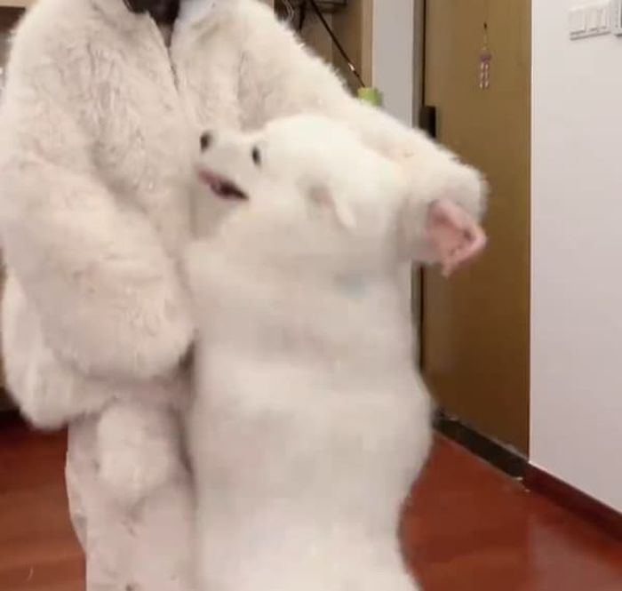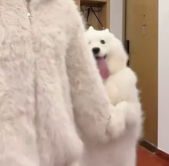 【引用:reddit】母親が着たのは白いふわふわの毛が全体に付いた、耳までついている動物型の特別な衣装でした。その姿はまるでサモエドが人間の姿になったかのようで、子犬の目には完全に“自分と同じ仲間”として映ったようです。計画を立てた飼い主は、この衣装を着て子犬に会ったとき、どんな反応が返ってくるのか試してみたかったのだといいます。