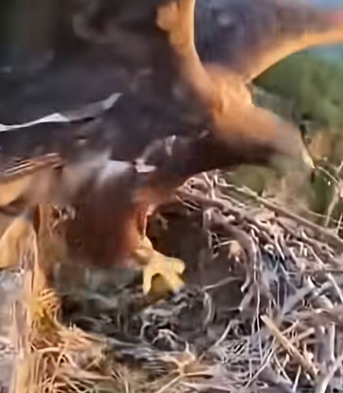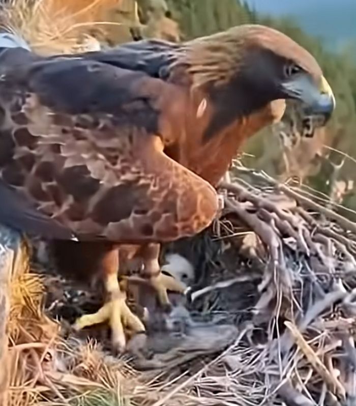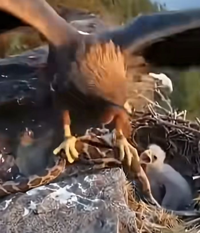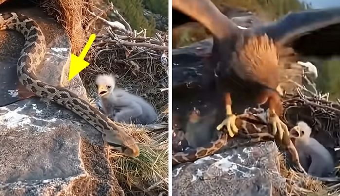【引用:アニマルプラネット】予想外の反撃を受けたヘビは身をくねらせ抵抗したものの、母ワシの強烈な打撃に圧倒され、ついには巣の縁から崖下へと追い落とされた。雛は間一髪で危機を免れ、母ワシは羽を広げて雛を守るように寄り添った。