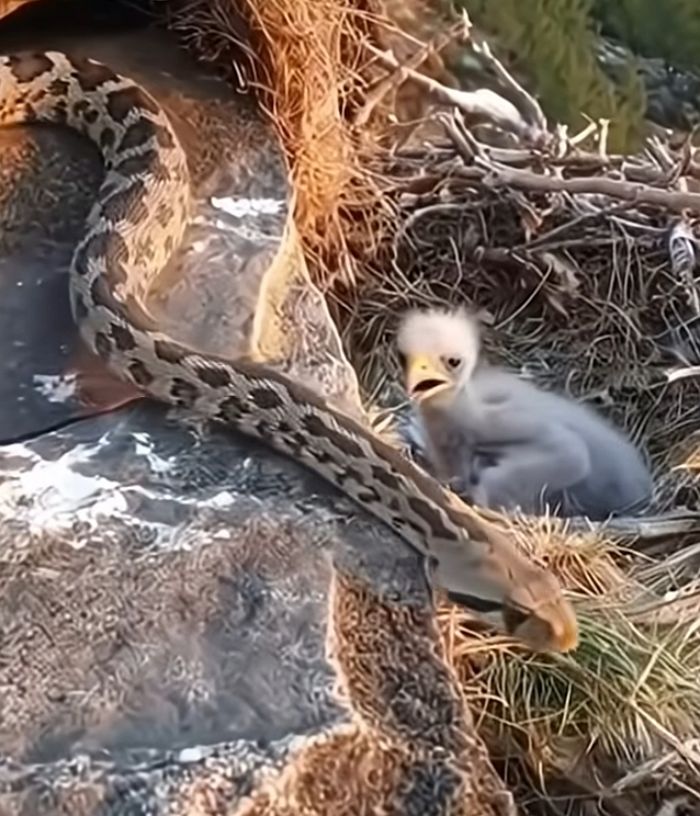 【引用:アニマルプラネット】その隙を狙うように、巣の近くの岩陰から大型のヘビがゆっくりと姿を現した。ヘビは長い胴体を滑らせながら巣へと迫り、雛は不安げな声を上げたが、すでにヘビは頭部を突き出し、命を奪える距離に達していた。