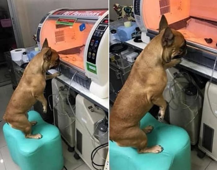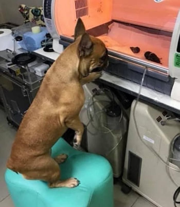 【引用: Imgur】これらの子犬たちは、早く生まれたか体が弱く、一人で呼吸したり体温を保ったりすることができなかったため、インキュベーターで治療と保護を受ける必要があったのです。フレンチブルドッグは看護犬として、母犬と離れて治療を受ける子犬たちをとても心配しており、インキュベーターの前からほとんど離れませんでした。子犬たちの様子を丁寧に確認しながら、まるで「私がここにいるから安心してね」と優しい眼差しで語りかけているかのようでした。