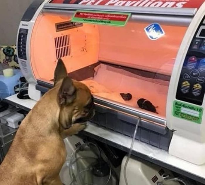 【引用: Imgur】写真は、タイの動物病院の分娩室で撮影されたもので、多くの人の心を打ちました。画像共有サイト「Imgur」などを通じて拡散され、大きな話題になっています。写真にはフレンチブルドッグの姿が写っていました。犬は透明なガラスのインキュベーターをじっと見つめています。中には、生まれたばかりの小さな子犬たちが横たわっていました。