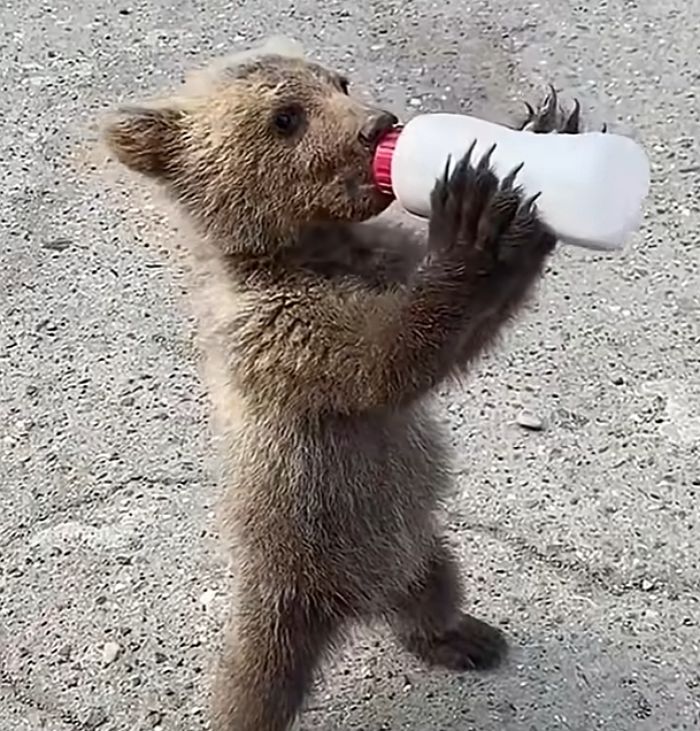 【引用:Youtube@AnimalHustle518】救助された赤ちゃんクマは、人間のもとで急速に成長した。まだ幼いが、2本の足でしっかりと立ち、大きな哺乳瓶を両手で持ってミルクを飲む姿は、見る者に大きな喜びと感動を与える。