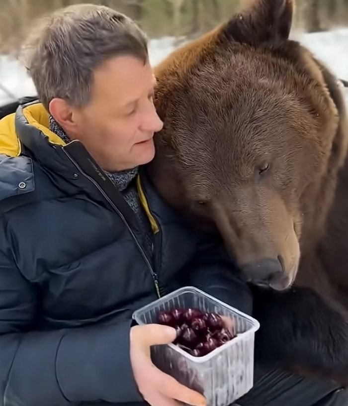 【引用:Youtube@AnimalHustle518】時が経って立派なクマに成長した彼は、今でも自分を救ってくれた人々と深い絆を分かち合っている。飼育員と思われる男性の腕に抱かれ、安心感と愛情を表現するクマの姿は、単なる野生動物と人間の関係を超えた家族のような絆を示している。人間が与えるチェリーを食べるクマの表情は、平和そのものだ。