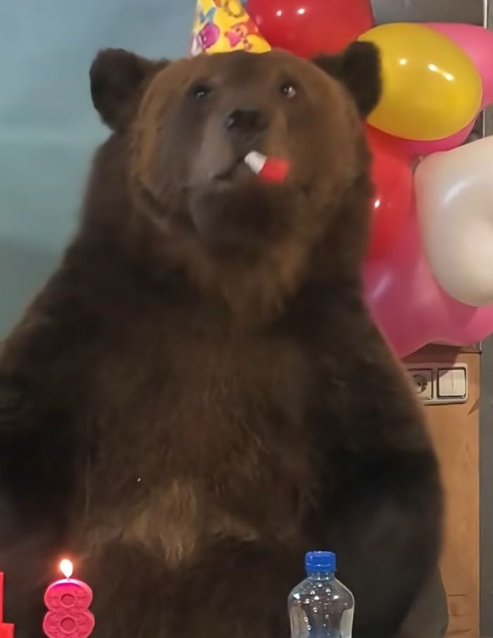 【引用:Youtube@AnimalHustle518】さらに驚くべきは、このクマが人々と一緒に誕生日パーティーを楽しむという事実だ。風船いっぱいの場所で、帽子をかぶり、ろうそくが灯った誕生日ケーキの前に座っているクマ。その姿はまるで、野生の危険を克服し、愛の中で得た幸福を象徴的に示している。