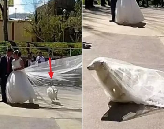 【引用:tiktok_@fannyproduccionesoficial】オソの体にふわりと絡んだベールは、まるで小さな新郎のように見え、現場には爆笑の渦が広がった。SNSに投稿された映像には「今日の主役は犬だ」「幸運を呼ぶハプニング」といったコメントが寄せられ、世界中で話題を呼んでいる。