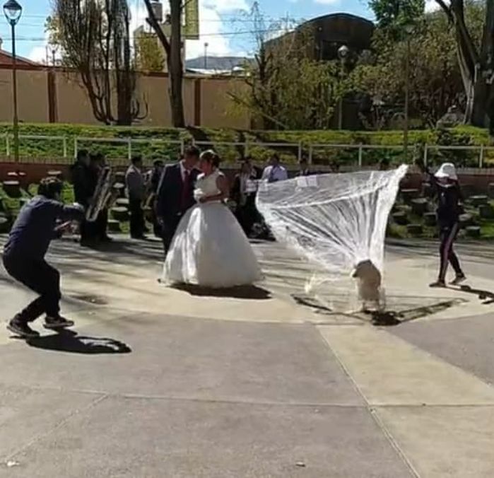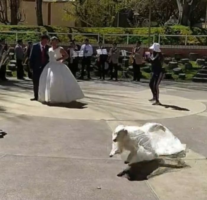 【引用:tiktok_@fannyproduccionesoficial】新郎新婦が姿勢を整え、最高の一枚を撮ろうとしていたその瞬間、オソが遠くから全力で走り込み、花嫁の長いベールに一直線。迷いなくガブリとくわえると、そのまま勢いよく引きはがし、誇らしげに会場周辺を駆け回った。