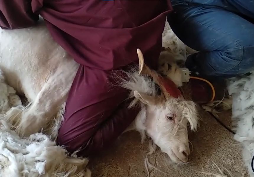 【引用:PETA 】PETAアジアが2022〜2024年にかけて中国・モンゴルのカシミヤ産業を調査したところ、ほとんど全ての農場で極めて残酷な行為が確認された。作業員は山羊を踏みつけて動けなくし、鋭い金属櫛で毛を引き抜くため、皮膚には深い傷が残り、山羊は悲鳴を上げる。しかし麻酔などの痛み軽減措置は一切行われていない。