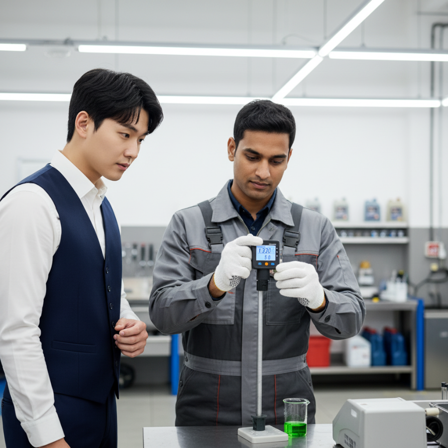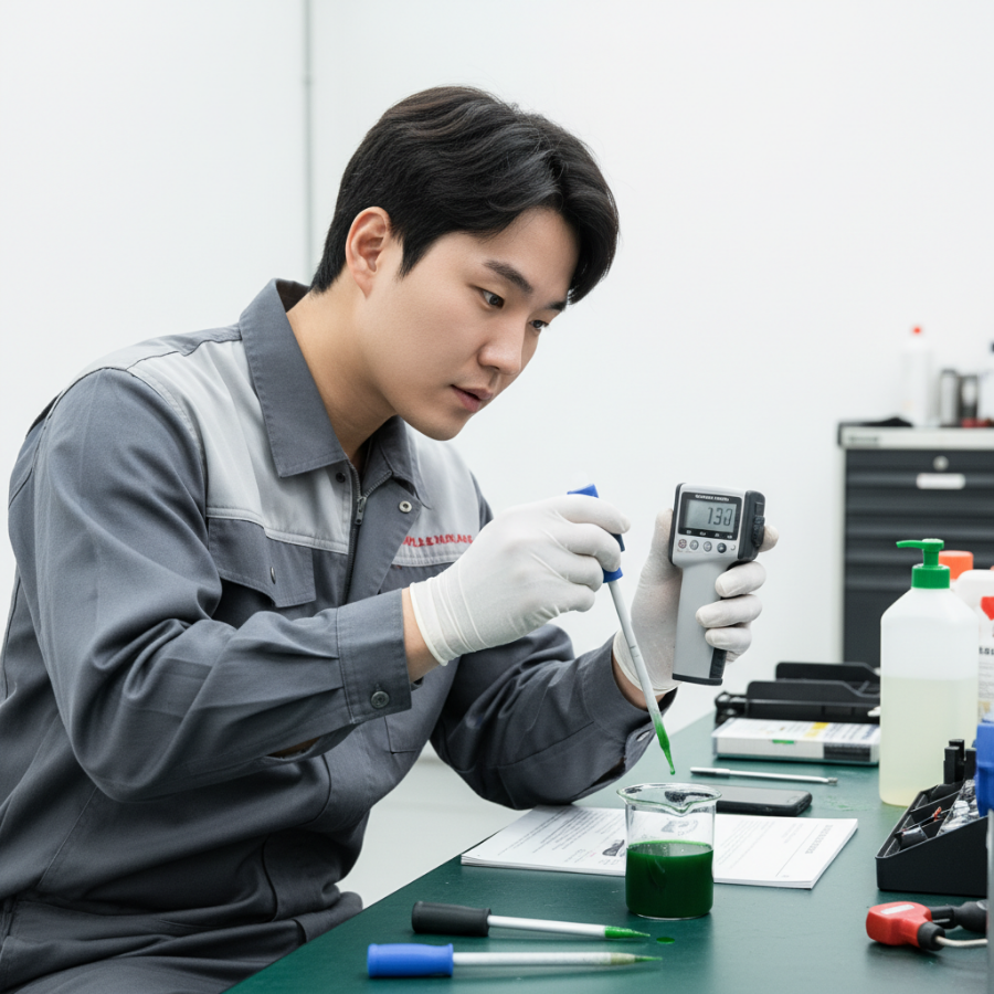 【引用:記事の内容と関連しAIツールで作成されたイメージ】最も確実なのは整備工場でクーラント液の比重やpH値を測定し、数値に基づいて交換時期を判断する方法だ。目視だけでは分からない内部の劣化状態を把握できる点が大きなメリットとなる。