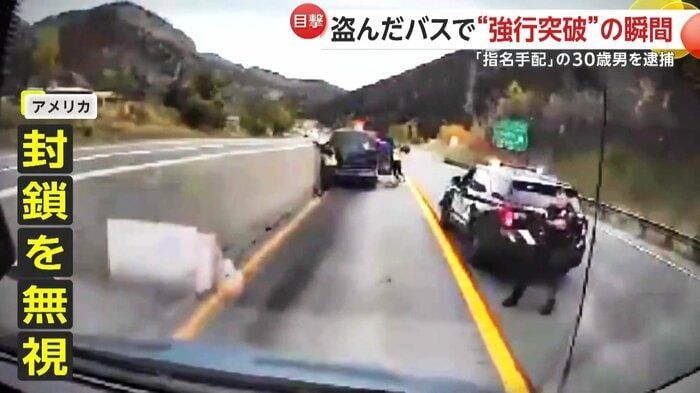 【引用:イット!】別のカメラ映像には、危険を察知した警察官が、慌てて中央分離帯をよじ登り、バスとの衝突を避けようとする様子が記録されている。現場は一歩間違えれば大惨事になりかねない、極めて危険な状況であった。警察は、このバスを運転していた男について、警察官の命を脅かしたとして殺人未遂の疑いで指名手配した。その後の捜査により、男は30歳であることが判明し、身柄は無事に確保された。盗んだバスで道路封鎖を突破し、警察車両や警察官を危険にさらした一連の行為は、極めて悪質なものといえる。警察は詳しい動機や経緯について、引き続き調べを進めている。