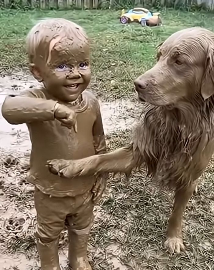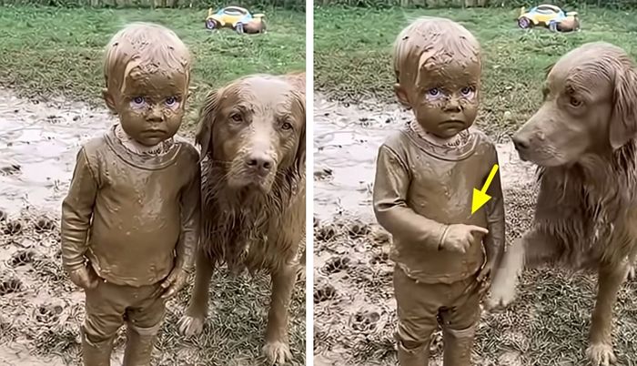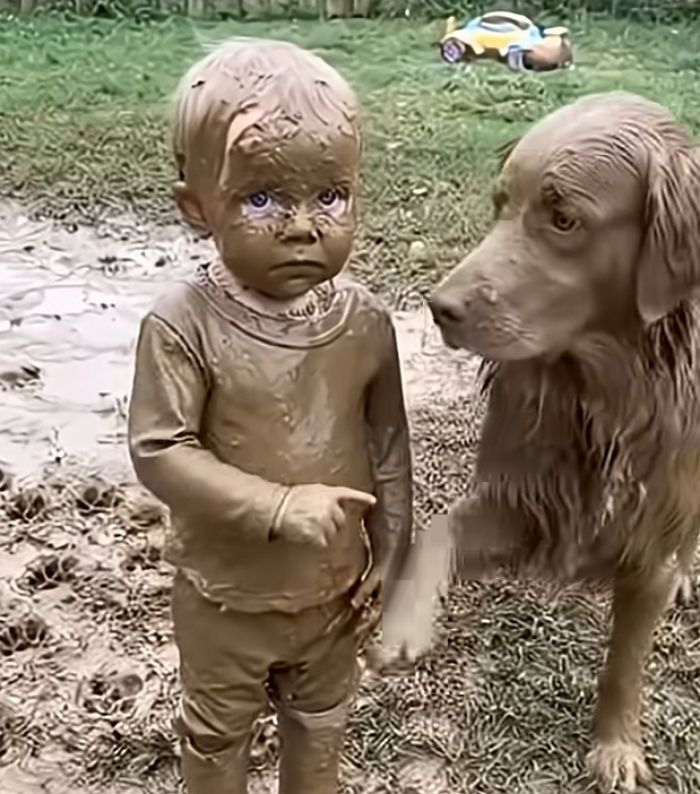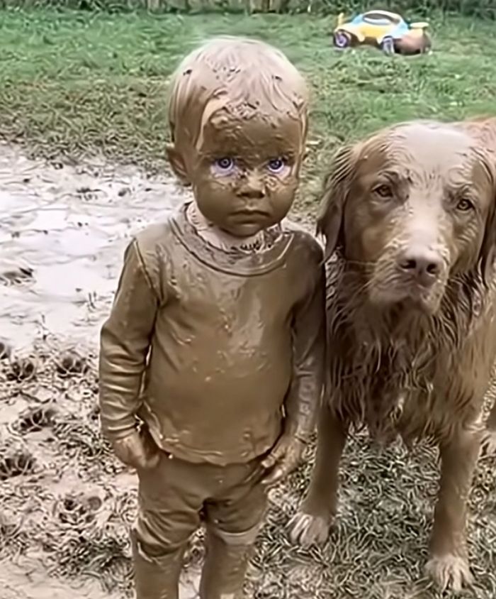 【引用:FunRushClipsYT】庭で子供と犬が遊んでいた。最初は二人ともおとなしく可愛く遊んでいるように見えた。母親が少し家事で目を離した隙に、子供と犬は庭の隅にある泥の水たまりに走っていったようだ。きれいだった小さな男の子と我が家の可愛い犬が、あっという間に全身泥だらけになって現れた。全身が泥で覆われ、顔だけかろうじて識別できる程度だった。