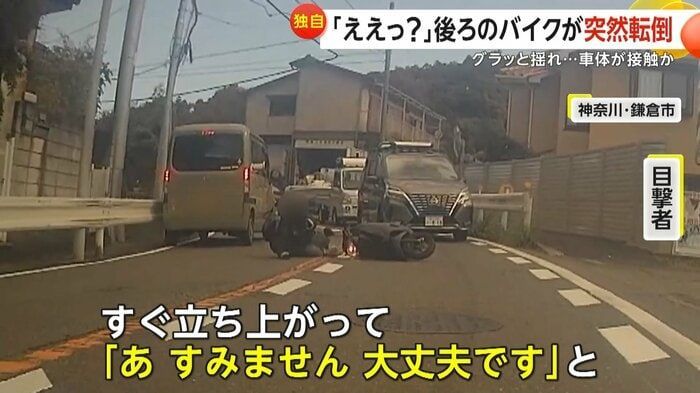【引用:FNN】神奈川・鎌倉市の曲がり道で10日、60代とみられる女性が運転するバイクが転倒し、対向車線へ投げ出される事故が起きた。前を走るバイクがバスに道を譲るため減速した際、後方のバイクの女性が対応できず追突する形で転倒したという。女性は対向車線に飛び出したが、走行中の車が急ブレーキで停止し、衝突は免れた。神奈川・鎌倉市をライダーがバイクで走っていた。突然、車体がグラッと揺れ、後方を確認した。そこでカメラが捉えたのは、バイクに乗って転倒した女性だった。目撃者は「後ろでおばさんが転んでいて、えっ?と思った」と当時の様子を語った。
