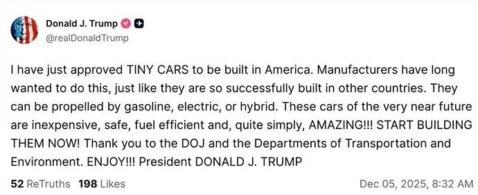 【引用:X】軽トラックは排気量や出力、車体サイズに厳しい制限があるため、巨大SUVやフルサイズトラックを好む米国の大衆市場とは距離がある。それでも大型車中心の市場に疲れを感じた消費者を軸に熱心なファン層が形成され、SNSでは関連グッズやミームが増加している。今回の政策転換の本来の狙いは、バイデン政権下で強化された燃費基準を緩和する点にあり、大統領は車両価格引き下げを目的と説明したが、専門家は長期的には燃料費負担が増す可能性を指摘している。米運輸省はその後、すべての車両は既存の安全基準を満たす必要があるとの立場を改めて示した。