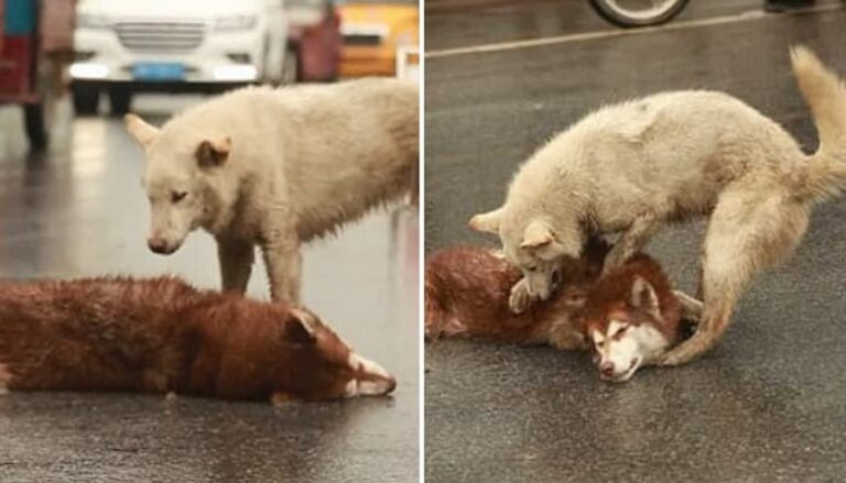 「お願い、起きて!」道路で息絶えた仲間を守り続ける白い犬...“最も切ない友情”に世界が涙