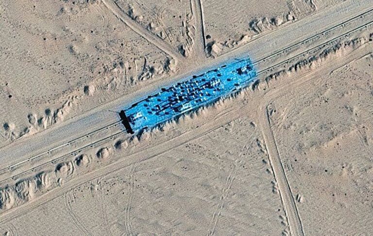 中国がタクラマカン砂漠に航空母艦の模型を建設し、ミサイルテストを行っていることが確認された。