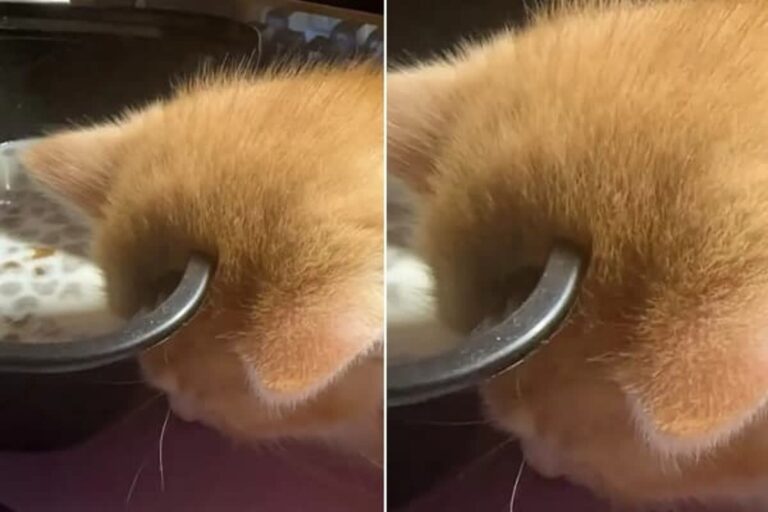 ご飯を食べている途中で寝てしまった子猫の面白い錯覚が話題に。頭が皿を突き抜けているように見える姿に驚きの声が上がった。