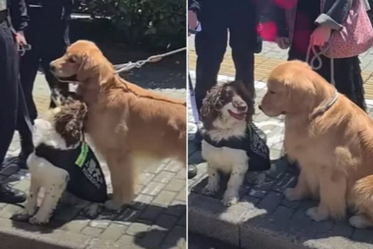 警察犬がパトロール中に出会ったゴールデン・レトリーバーに一目惚れするユーモラスでロマンチックな瞬間。