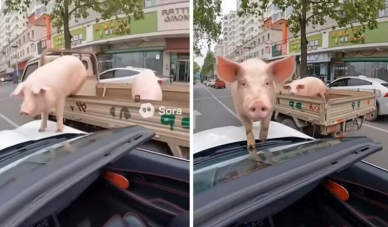 「乗り換えま〜す!」トラックからオープンカーへ…都心で豚が見せた“奇跡のジャンプ”