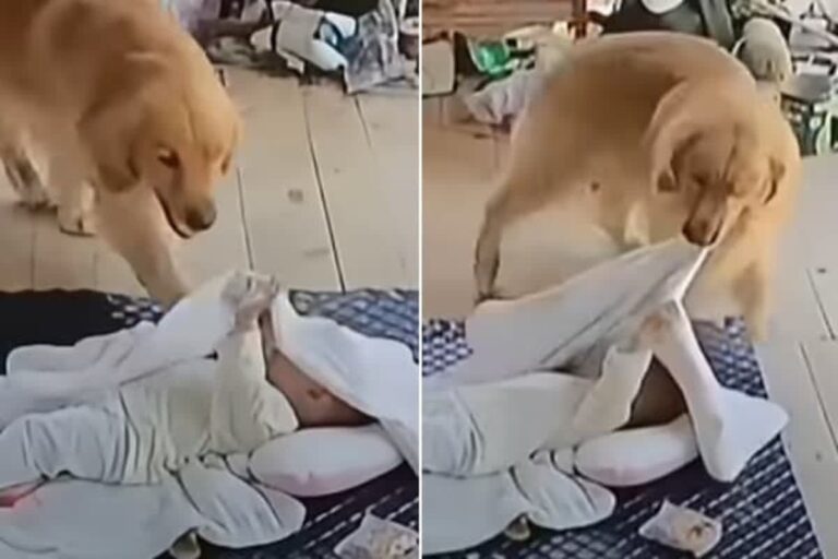 ゴールデン・レトリバーが赤ちゃんを毛布から救い、命を守る感動的な瞬間が描かれています。