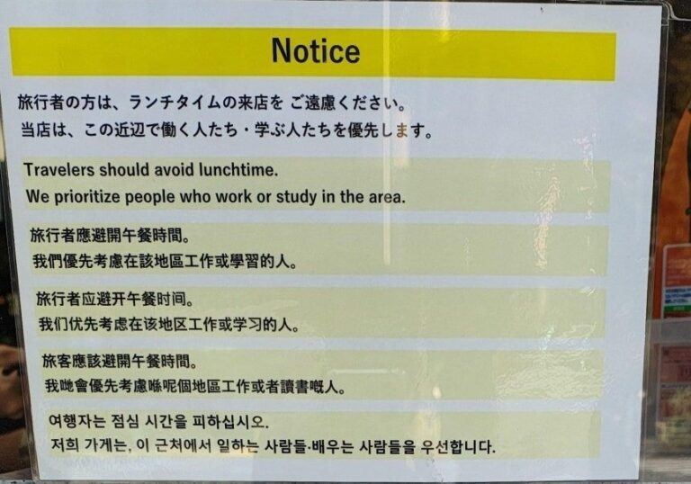 日本のそば店が観光客の来店を控えるよう張り紙を掲示し、撤去された。オーバーツーリズムの影響が浮き彫りに。