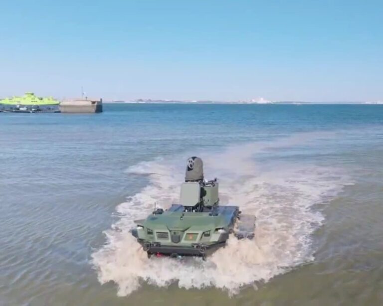 ドイツの無人地上車両「ミッション・マスター2.0」が海から自律走行でビーチに到達し、効率的な連携能力を示した。