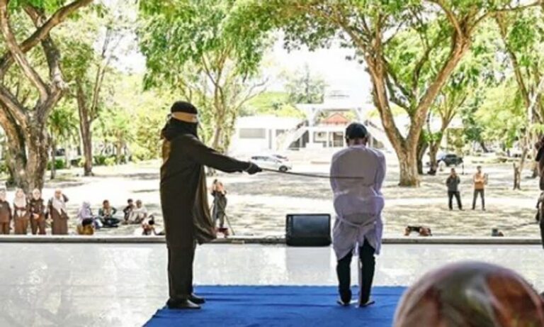 インドネシア・アチェ州で、公共の場でキスをした2人の男性が公開鞭打ち刑に処された。