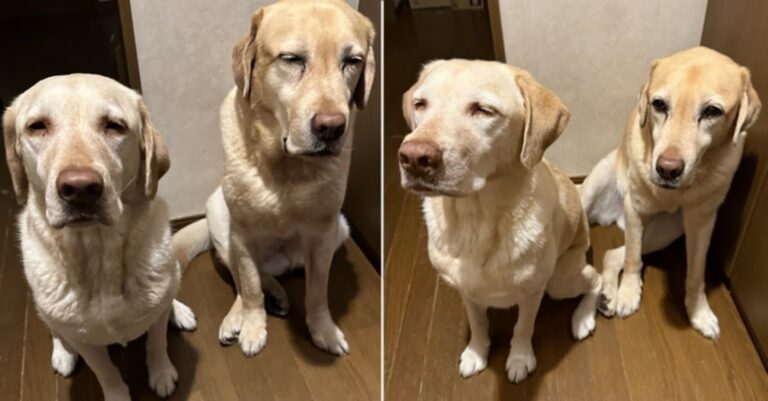 眠い目をこすりながらも玄関で飼い主を見送るラブラドール兄妹メルツ&ミーナの姿にSNS感動
