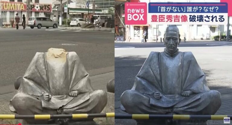 名古屋市で豊臣秀吉像の首が切断され、商店街組合は意図的な破壊行為の可能性を調査中。