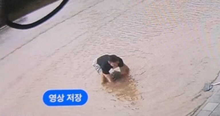 仁川での豪雨中、父親がマンホールのふたを持ち上げ水害防止に尽力し、話題となった。