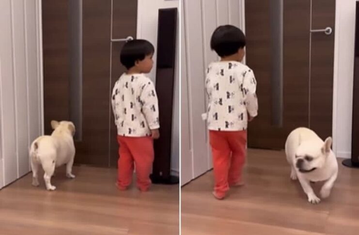 自分も犬になったかのように…フレンチブルドッグと3歳児の真似っこ合戦が心温まる!「この友情がずっと続きますように」の声