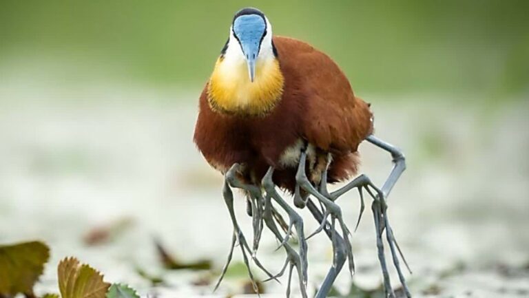 アフリカレンカクは特異な育児法で、オスが雛を守るために多くの足のように見える。