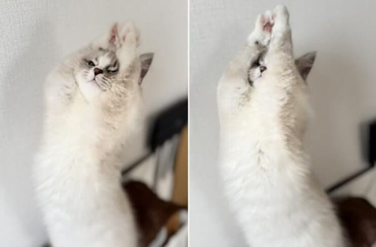 猫が突然二本足で立ち上がり、前足を空に向かって伸ばす愛らしい姿がSNSで話題に。
