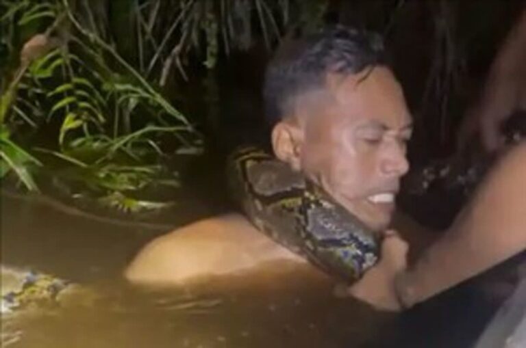 インドネシアで男性が6メートルのニシキヘビに巻きつかれ水中に引きずり込まれる瞬間が映像に捉えられた。