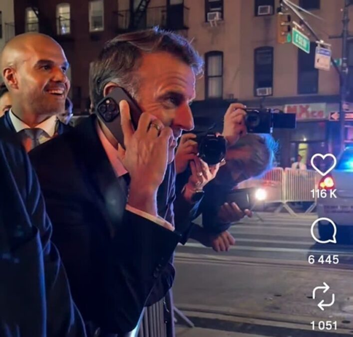 マクロン大統領がトランプ大統領の車列によりニューヨークで足止めされ、ユーモアを交えた会話をした。