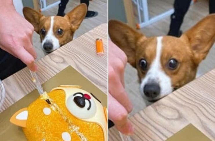 コーギーが犬の形のケーキを切られる様子に驚き、困惑する姿が話題に。家族の誕生日祝いの一幕。