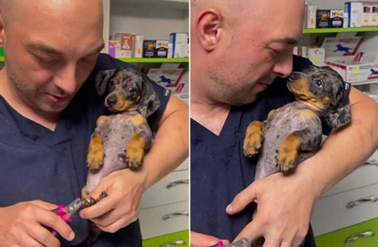 「初めての爪切り…」開いた目が可愛すぎる!ダックス子犬と優しい獣医さんの出会い