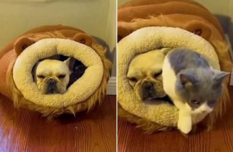 猫のハウスに犬が無理やり入り、おならをしたことで猫たちが驚いて飛び出す様子が話題に。