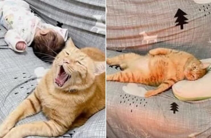 猫が育児を手伝うも、疲れてソファで寝てしまう姿が愛らしい。育児の大変さを実感する瞬間。