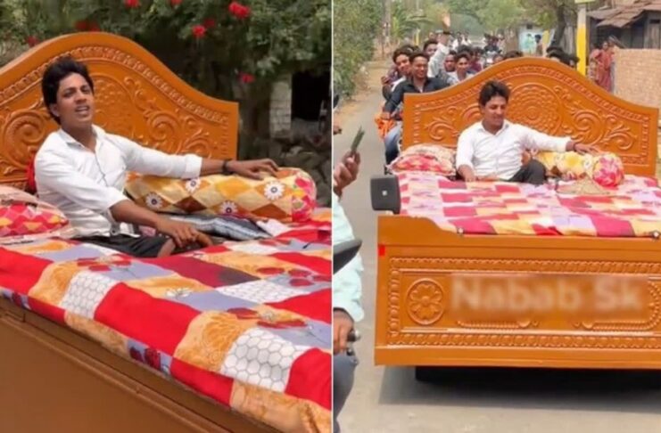 男性がベッドを自動車に改造し、道路を走行する姿が話題に。安全性は確認されず、警察に停止命令。