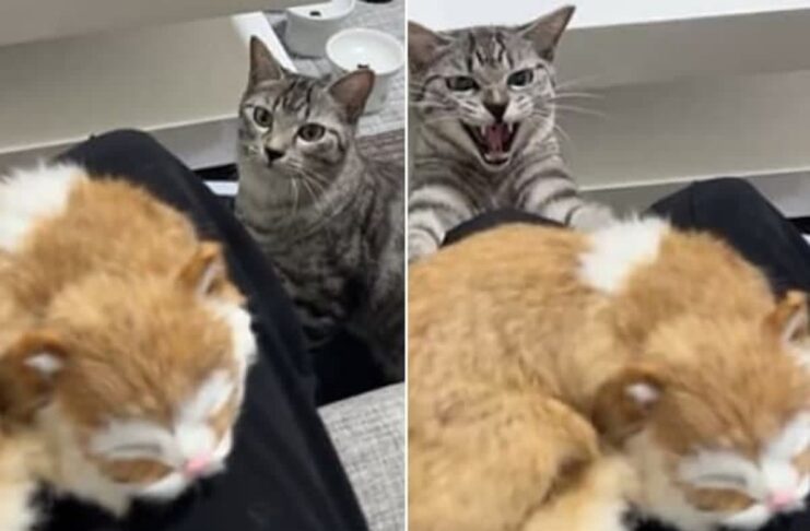 愛猫が飼い主の膝に乗るぬいぐるみ猫に嫉妬し、挑発的な態度を見せた実験の様子を紹介。