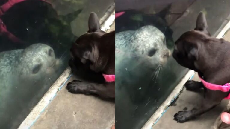 フレンチブルドッグのルーシーが水族館でアザラシと対峙し、ネットで話題に。ガラス越しの激しい神経戦。