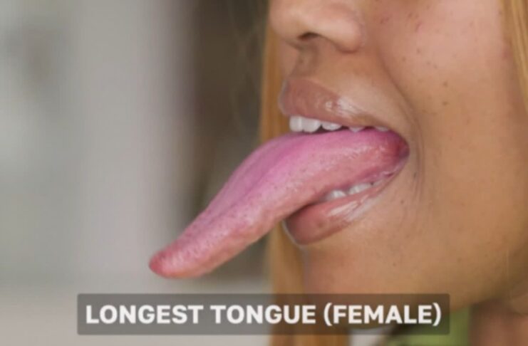 アメリカの女性が9.75cmの舌の長さでギネス記録を保持し、驚きの技を披露しています。