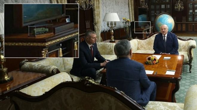 ルカシェンコ大統領がキルギスの首相など当局者と会談する様子を捉えた写真を見ると、片方の机の上に置かれた透明な箱の中にミサイル発射車両の縮小模型が確認できる。オレシュニクがまもなくベラルーシに配備されるという事実が事前に察知されていたわけだ。