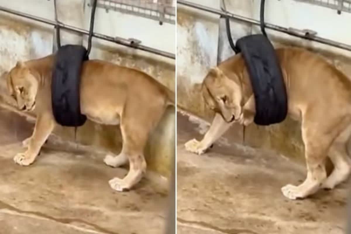 • 「百獣の王」の威厳どこへ?雌ライオンがタイヤ遊びでドジ全開