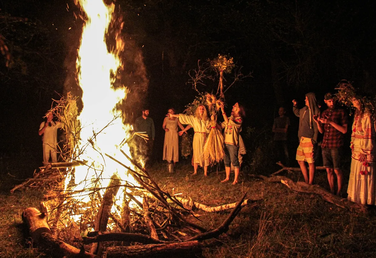 広大な麦畑とひまわりが咲き誇る谷間に夕日が沈む頃、数百人が丸太のピラミッドを囲んで輪を作った。焚き火に火が付き、炎が黄昏の空に舞い上がると、音楽が次第に大きくなり、人々は薪の山の周りで手をつないで回った。浄化の儀式として、何人かは燃え盛る焚き火を飛び越えた。