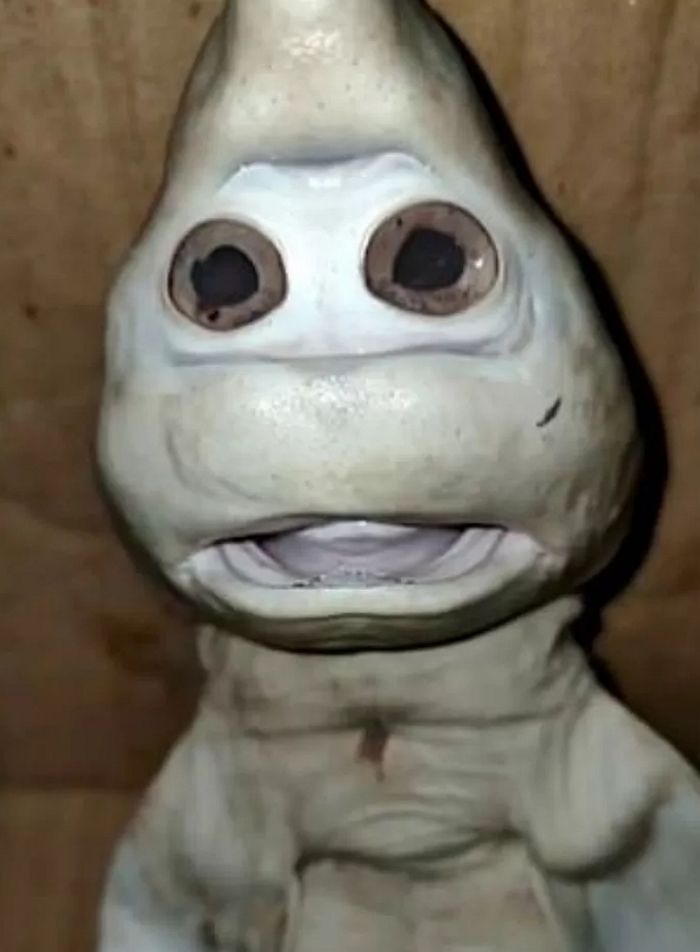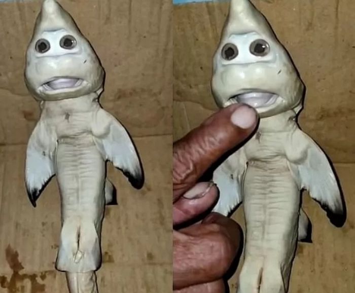 【引用:YouTube デイリー・メール】この子ザメは、漁師アブドゥラ・ヌレン氏の網にかかった成体の雌ザメの腹の中から見つかった三匹のうちの一匹で、他の個体が母ザメに似た通常の姿だったのに対し、この一匹だけが人間のような外見をしていたという。